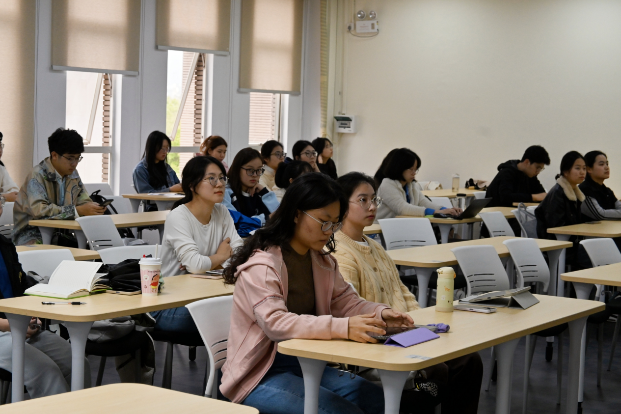 在核心讲解部分,林老师凭借自身丰富的指导经验,从选题的精妙构思、文献综述的系统梳理、研究方案的严谨设计、数据资源的有效获取,以及人工智能辅助工具的合理运用等多个维度,对开题报告的写作要点与技巧进行了全面且深入的阐释。讲座过程中,林老师语言生动风趣,穿插大量丰富详实的实际案例,将原本晦涩的学术知识以通俗易懂的方式呈现给同学们。同时,他积极与台下同学展开互动交流,耐心解答同学们提出的各类疑问,引导同学们更好地理解并运用写作方法,现场互动频繁,学习氛围浓厚。