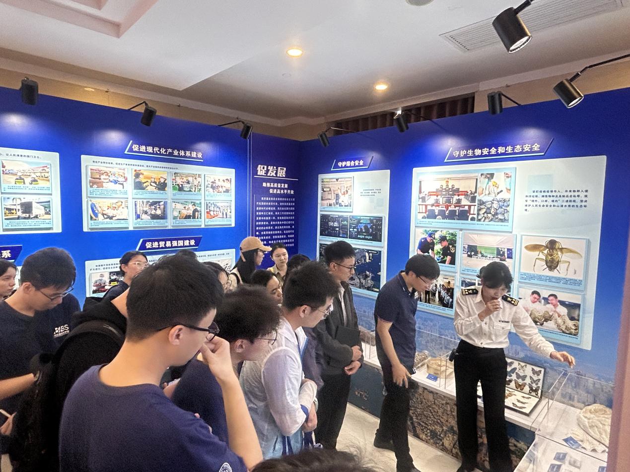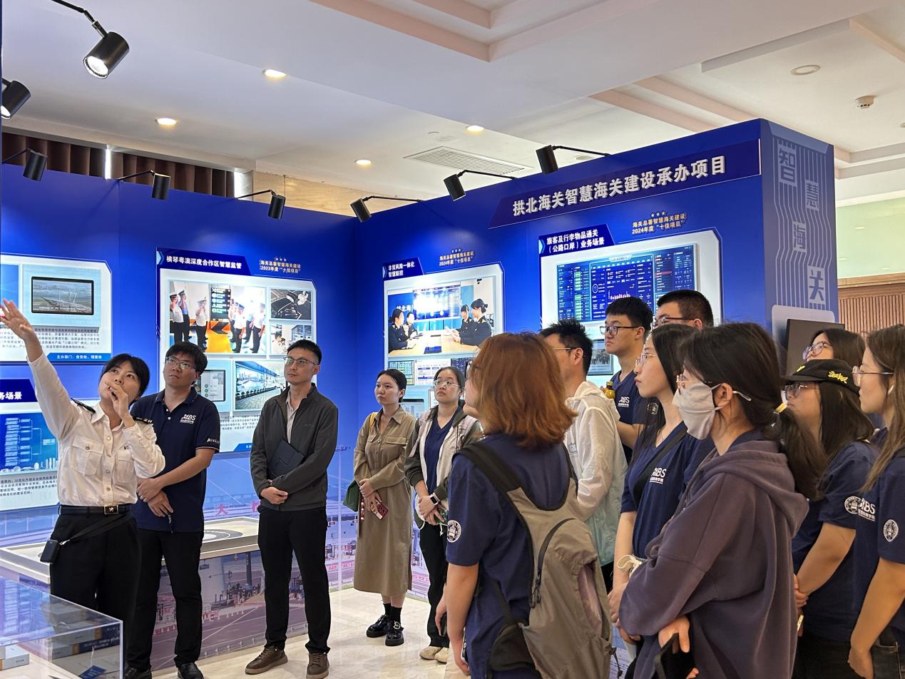 活动首站,参访师生在海关讲解员的引导下,系统观摩了智慧海关建设“智关强国”行动专题展览。展览中集中呈现了拱北海关获优秀改革项目的创新举措、获评全国智慧海关建设的相关项目,让师生们直观感受到海关改革如何通过技术赋能,在提升通关效率、守护国门安全、服务民生需求中发挥关键作用。