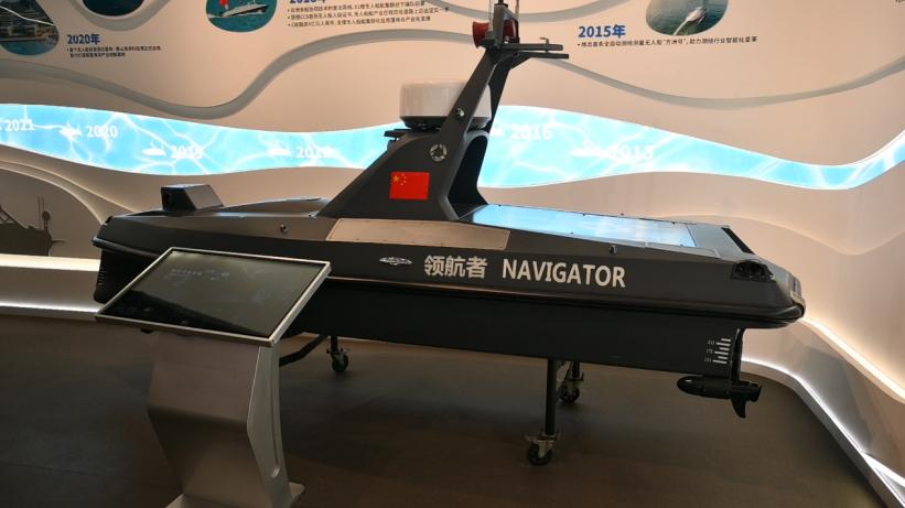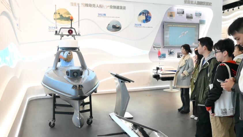 随后,讲解人员围绕展厅核心展品,系统呈现了企业的技术创新体系:从凝聚586项专利的技术展示墙,到基于北斗卫星系统的通信遥感技术突破;从具备隐身涂装与抗寒特种设计的无人拦截船,到覆盖内河作业、海洋工程等多场景的分级无人船矩阵——每一处细节都生动呈现了企业在智能装备领域的自主研发实力。