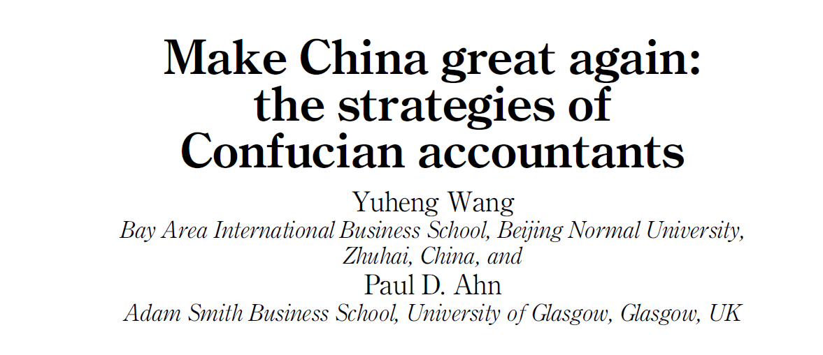 The homegrown Confucian accountants share cultural-cognitive characteristics with neighbouring social actors, such as their clients and government officials, who have been inculcated with Confucianism and the state’s cultural confidence policy in pursuit of a “socialist market economy with Chinese characteristics”. Those accountants try to enhance their social standing and revenue stream by strategically demonstrating their difference from Big-4 accountants. For this purpose, they wear Confucian clothes, have Confucian props in their office, employ Confucian phrases in their everyday conversations, use Confucian business cards and construct and maintain guanxi with government officials and clients.